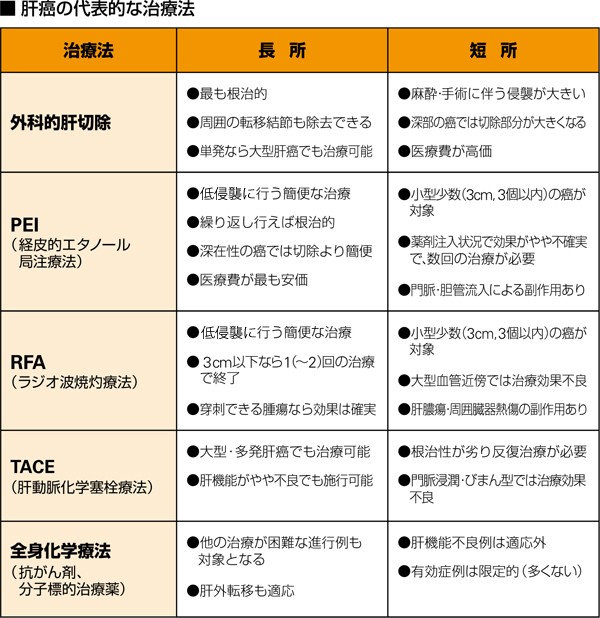 下の表は代表的な治療法の長所・短所をまとめたものです。肝癌に対して行われる様々な治療法は、これ以外に「根治性」「再発リスクの大きさ」「癌の存在部位」など、全ての観点を考慮して決定しなければならず、ただ一つの治療法が最も優れているということはありません。種々の治療法を柔軟に組み合わせて行うこと(集学的治療)こそが、肝癌患者の生活の質(Quality oflife)や生存率の向上につながるのです。