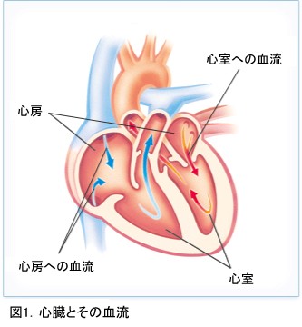 心房の収縮により、その下にある左心室と右心室に血液が満たされます。電気信号が心室に送られると心室が収縮し、全身に血液を送ります。(図1)心拍として感じられるものが、心筋(心室)の収縮です。少し休んだ後にこのサイクルが繰り返されます。