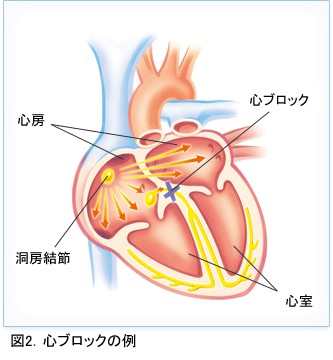 心房と心室をつなぐ刺激伝導系に何らかの問題があると心ブロックの状態になり、洞房結節から送られる心臓自体のペースメーカ(ペースメーカー)信号の心室への到達が遅れたり、心室まで届かなくなることがあります。