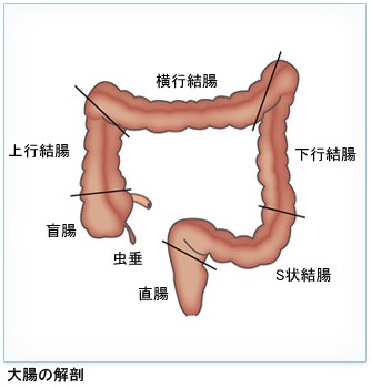 大腸の機能は、食物繊維の発酵で生じた栄養や水分の吸収、便の形成と貯留が挙げられます。大腸は管状で口から肛門に至る消化管の最後のパートを成しています。一般的にその形は数字の「7」に類似しており、長さは約80cm程度で口側から盲腸、上行結腸、横行結腸、下行結腸、S状結腸、直腸、肛門管に分けられます。しかし形・長さとも非常に個人差があり、また体型や腹部の手術等の影響もうけることが多い臓器です。