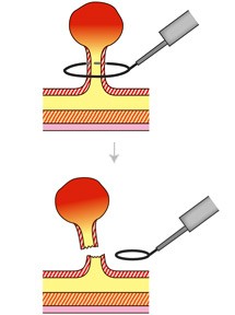前述した腸の壁の5層構造のうち粘膜下層部分に局注針を用いて生理食塩水などの液体を注入(局注)し病変を下から盛り上げます。つぎにスネアを正常粘膜も含めるように掛けて絞めてから、通電させ焼き切ります。局注する目的は、スネアを掛かりやすくすることと止血の効果が得られるからです。