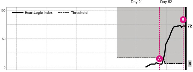 HeartLogicインデックスの上昇に続いて、AT/AFが確認された70歳女性。医師から連絡した時点で、患者は心不全症状を訴えたため、その後βブロッカーが増量された。