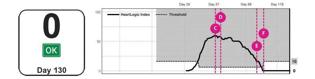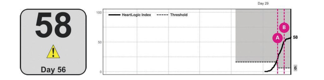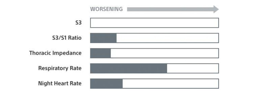注記:現時点でHeartLogic 機能が提示する情報と心不全増悪兆候との関係は確立していない。HeartLogic アラートが発現した際は、患者の状態や他の指標とあわせて総合的に 評価した上で、治療の要不要及び治療方針を決定すること。