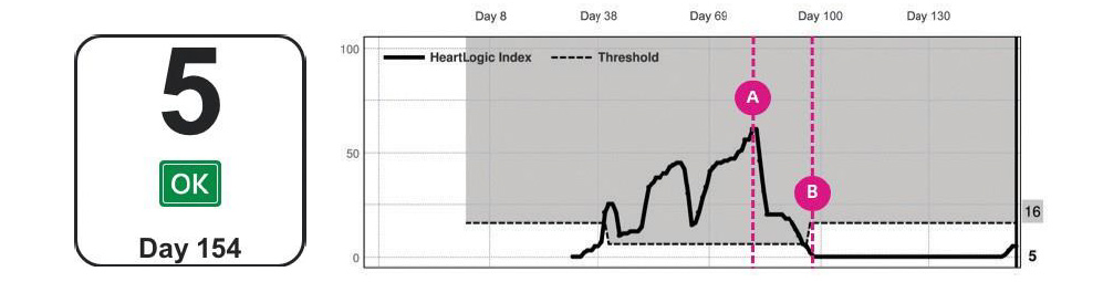 (B) 98日目:HeartLogicインデックスが0に回復。