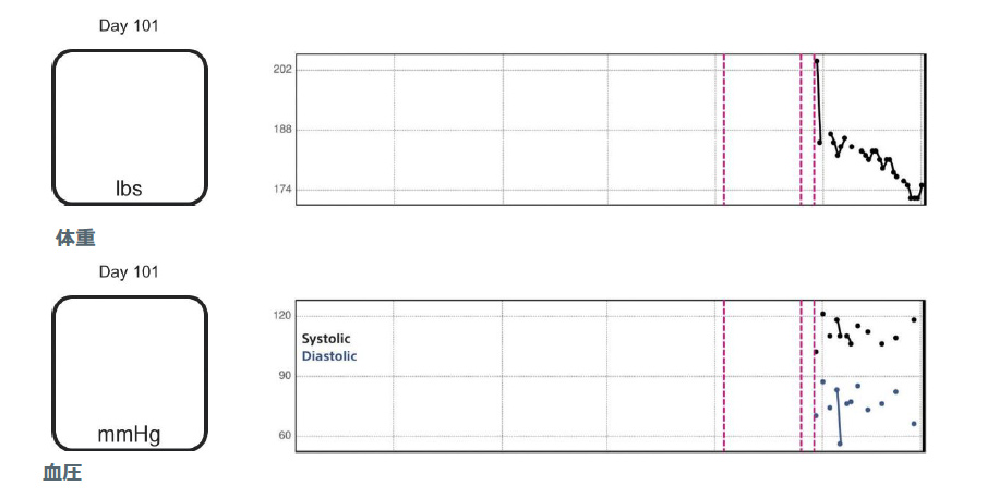 (C) 69日目:クリニックの受診以降、患者はLATITUDEコミュニケータを接続し、Bluetooth対応の体重計と血圧計の使用を開始した。その後1ヵ月間で30ポンド(13.6㎏)の体重減少が記録された。胸郭インピーダンスでは心不全症状の悪化は特定されなかった。