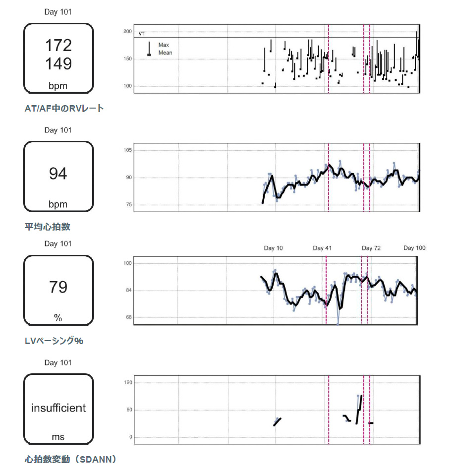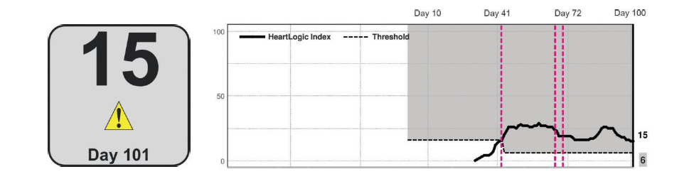 注記:現時点でHeartLogic 機能が提示する情報と心不全増悪兆候との関係は確立していない。HeartLogic アラートが発現した際は、患者の状態や他の指標とあわせて総合的に 評価した上で、治療の要不要及び治療方針を決定すること。