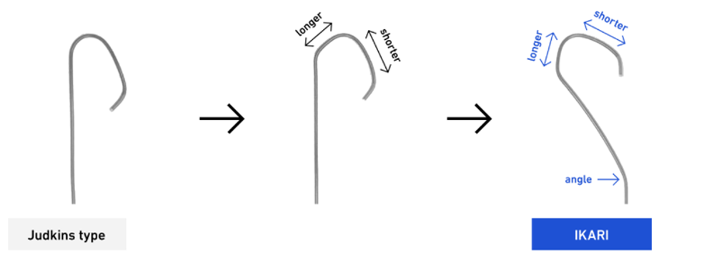 IKARI Leftカテーテルは、大腿動脈アプローチのスタンダードカテーテルであるJudkins Lカテーテルの変形です。3か所の変形を加えることで、橈骨アプローチに対応し、Judkinsカテーテルと同じ操作方法でカテーテルを冠動脈に挿入することができます。左冠動脈には、基本カテーテルを押すだけで入ります。