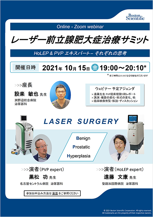 レーザーBPH治療HoLEP/核出術・PVP/蒸散術の異なる術式のエキスパート同士の意見交換や特性・適応などに踏み込んだWebセミナーです。同様の手技を取り組まれている/検討されている 全ての先生方を対象にしておりますので、どなたでもご参加いただける内容になっております。