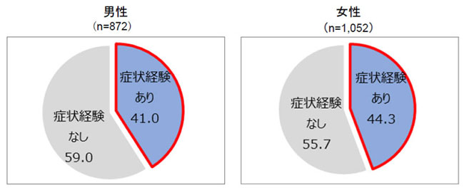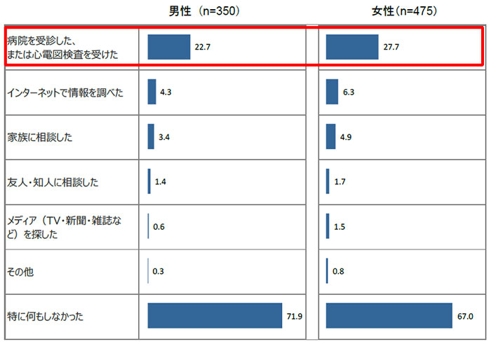 - 一般生活者において、心房細動の兆候となる症状を経験した人は、65 歳以上の男性で41.0%、女性で44.3%に上りますが、その内、心電図検査を受けたり、病院を受診したりした人は男性で22.7%、女性で27.7%にとどまりました。