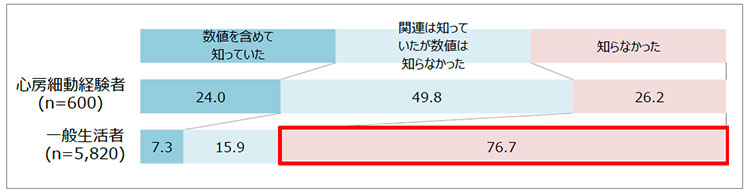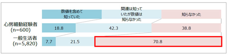 - 一般生活者において、心房細動が将来的な脳卒中リスクを高めることを「知らなかった」割合は76.7%、また、脳卒中により介護が必要になることを「知らなかった」割合は70.8%に上りました。