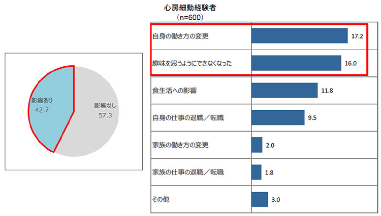 - 患者さんの中で、心房細動により生活に影響があったと答えた人は42.7%。具体的な影響として、「働き方を変えた」人が17.2%、「趣味を思うようにできなくなった」人が16.0%でした。