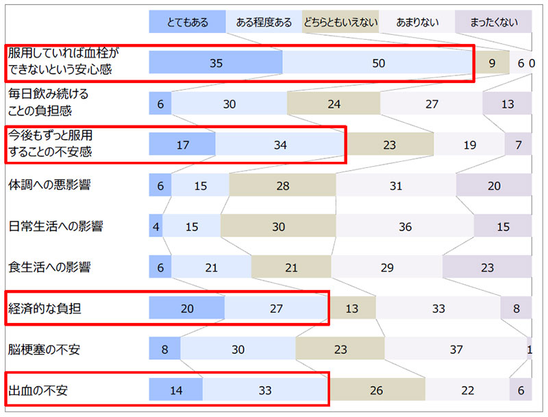 - 抗凝固薬の服薬経験者のうち、血栓を予防する安心感を得る人が85.0%に上る一方、継続的な服用への不安感がある人が51.0%、経済的負担、出血の不安を感じている人がそれぞれ47.0%に上りました。