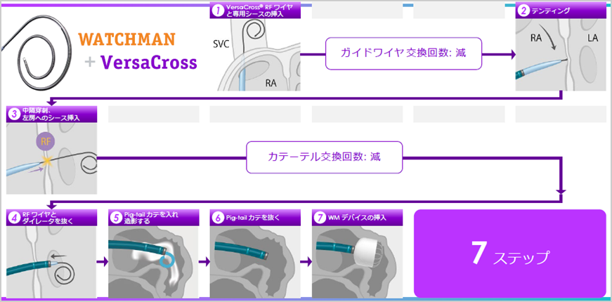 本製品は、VersaCross RFワイヤ(高周波型ワイヤー穿刺針)、接続ケーブル、ダイレータで構成されています。既存品は心房中隔穿刺位置までのアクセスには汎用シースを、治療部位への移動は治療用デバイスに含まれる遠位端可動型(専用)シースが用いられていましたが、本製品は、弊社治療用デバイス(POLARx3) 、FARAPULSE4)、WATCHMAN5))との併用を意図してさらなる開発を進めたことで、汎用シースを使用することなく手技を行うことができるようになりました。従来のシステムと比較し、使用するシースの数を削減することで、医療コストの最適化に貢献します。また、カテーテルの交換回数が減ることで、空気塞栓などの合併症リスクの低減が期待されるとともに、手技時間の短縮や負担軽減にもつながります。WATCHMAN5)を活用した左心耳閉鎖術では、従来の手技では14の工程が必要でしたが、VersaCross Connectを使用することで7工程に短縮され、手技の簡便化と医療従事者の負担軽減を実現します。