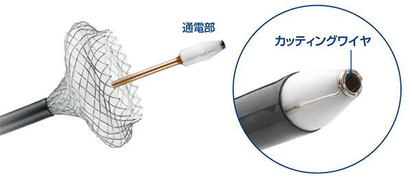 システム先端に通電部を有し、本製品のみで一期的な瘻孔形成手技が可能になりました。機器の交換による合併症のリスク低減と手技時間短縮に貢献します。