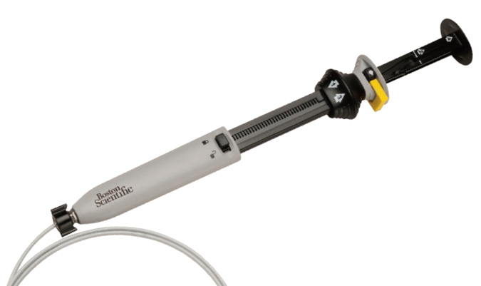 瘻孔形成補綴材は段階的に展開・留置されます。操作手順番号がシステム本体に明記され、各段階でロック機能がついています。