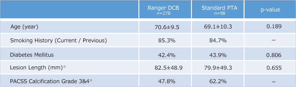 主な患者/病変背景:両郡間で類似したベースライン特性