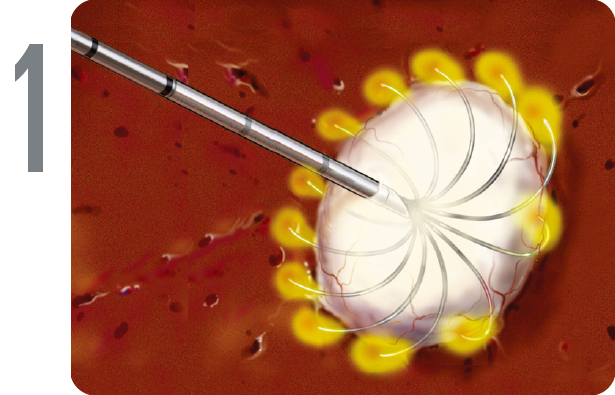 - 傘形に展開するLeVeenニードルは腫瘍を正確に捉え、包み込むように焼灼します。