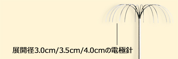 - LeVeenニードルに採用されたArray Technologyは、各展開針の間隔を約1cm前後に保っています。それにより、均一で安定した焼灼が行えます。