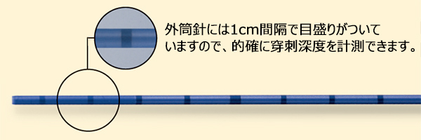 - イントロデューサ・セットの外筒針には1cm間隔で目盛りがついていますので、正確に穿刺深度を把握できます。
