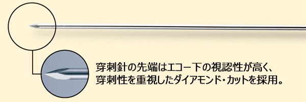 - イントロデューサ・セットの穿刺針の先端はエコー下の視認性が高いダイアモンド・カットを採用しておりますので、容易な穿刺をサポートします。