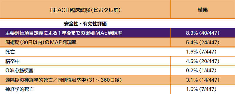 * 主要有害事象(MAE):手技後24 時間以内の非Q波心筋梗塞、手技後30 日以内の脳卒中・Q波心筋梗塞および死亡、手技後31日から360日までの同側性脳卒中・神経学的死亡