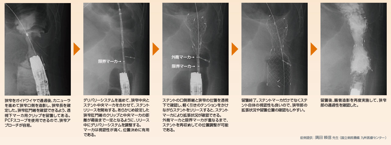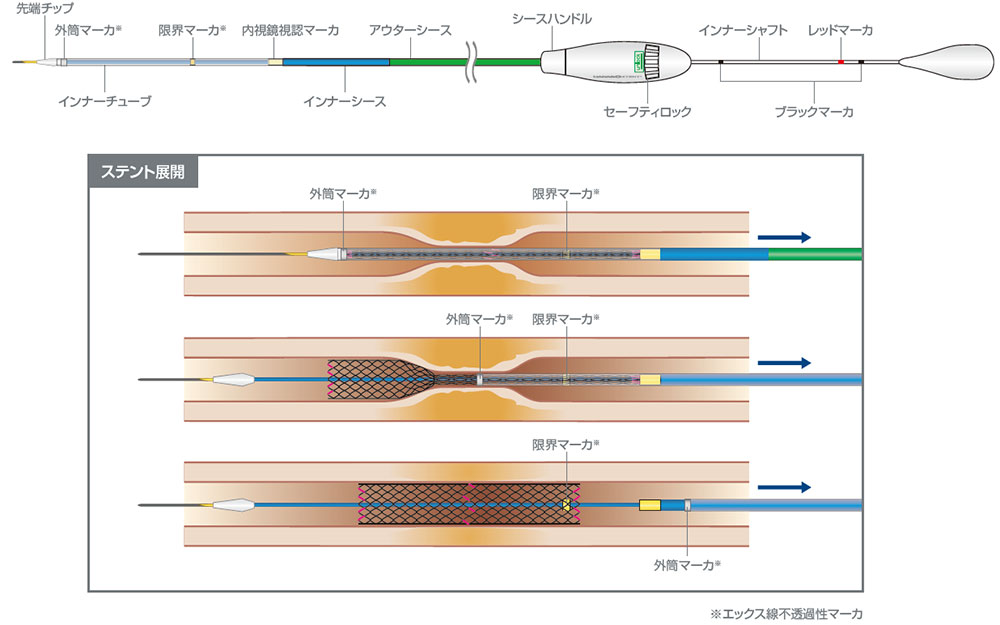 また、従来品より大きくなった12箇所の透視下ゴールドマーカと内視鏡イエローマーカで、最適な長さのステントの意図した場所への留置が期待できます。