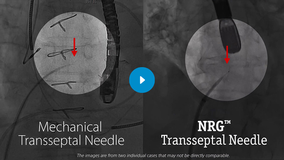 Imagens clínicas comparando a agulha transeptal NRG a uma agulha transeptal mecânica