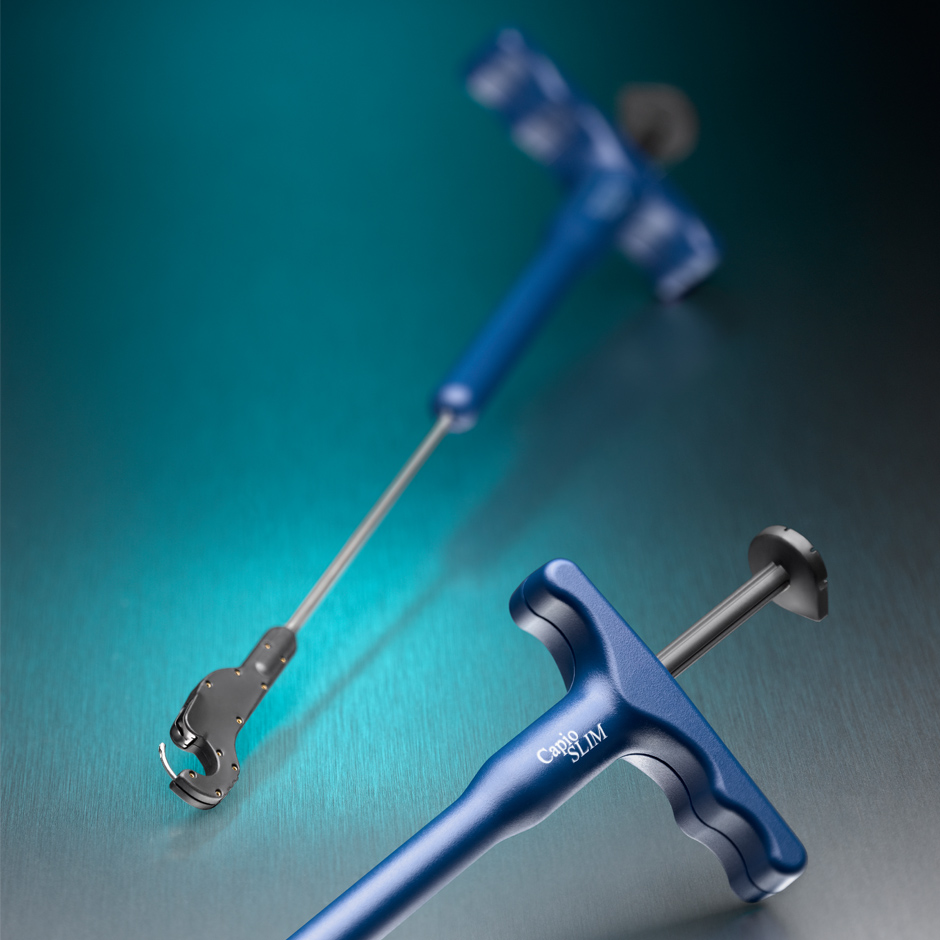 O dispositivo de captura de sutura Capio SLIM está disponível em um formato reduzido para minimizar o espaço necessário dentro do campo cirúrgico e facilitar o carregamento da sutura, além de oferecer um engate afunilado, concebido para proporcionar consistente facilidade de uso.