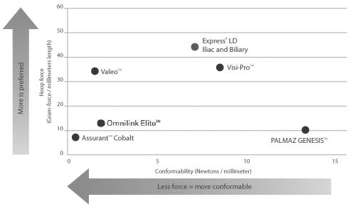 Compression Resistance measured as the force required to compress the fully expanded stent. Compression Resistance measured using a hoop force tester in 37° air. Conformability measured by torque required to achieve a constant curvature target as measured by angular deflection. Bench testing performed by Boston Scientific Corporation. Data on file. N = 3. Express LD tested: 8 x 37 mm. Visi-Pro tested: 8 x 37 mm. Palmaz Genesis tested: 8 x 39 mm. Omnilink Elite tested: 8 x 39 mm. Valeo tested: 8 x 36 mm. Assurant tested: 8 x 40 mm. Bench test results may not necessarily be indicative of clinical performance.